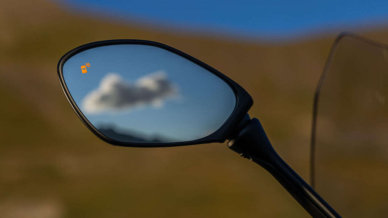 後方のミリ波レーダーが後続車を検知し、バイクの死角に車両が存在する場合、バックミラーに内蔵されたインジケーターが点滅してライダーに通知する機能です。