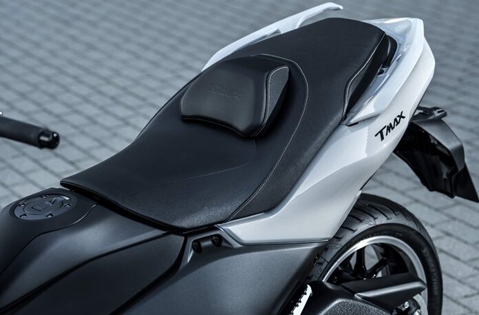 TMAXならではのブーメラン形状のサイドパネルや、後上がりのシャープなマフラー、「彫刻的」と表現する新形状シートなど、より精悍な印象へと変更しました。